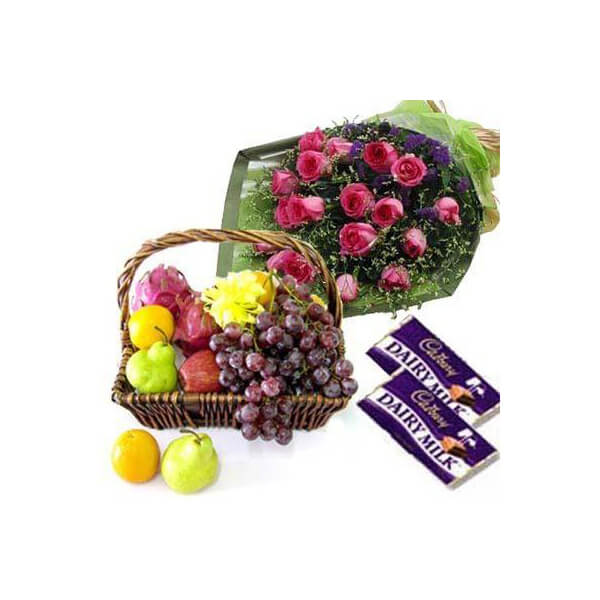 Basket of Mixed Roses with Dairy Milk Chocolates & Teddy