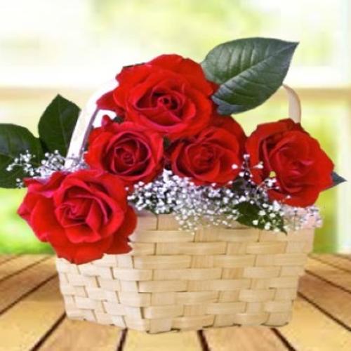This elegant basket features 6 handpicked red roses beautifully arranged with soft gypsophila (baby’s breath) and fresh green leaves. Placed in a stylish woven basket, it creates a charming and romantic presentation. Ideal for anniversaries, birthdays, or heartfelt surprises, this arrangement is a timeless symbol of love and affection.