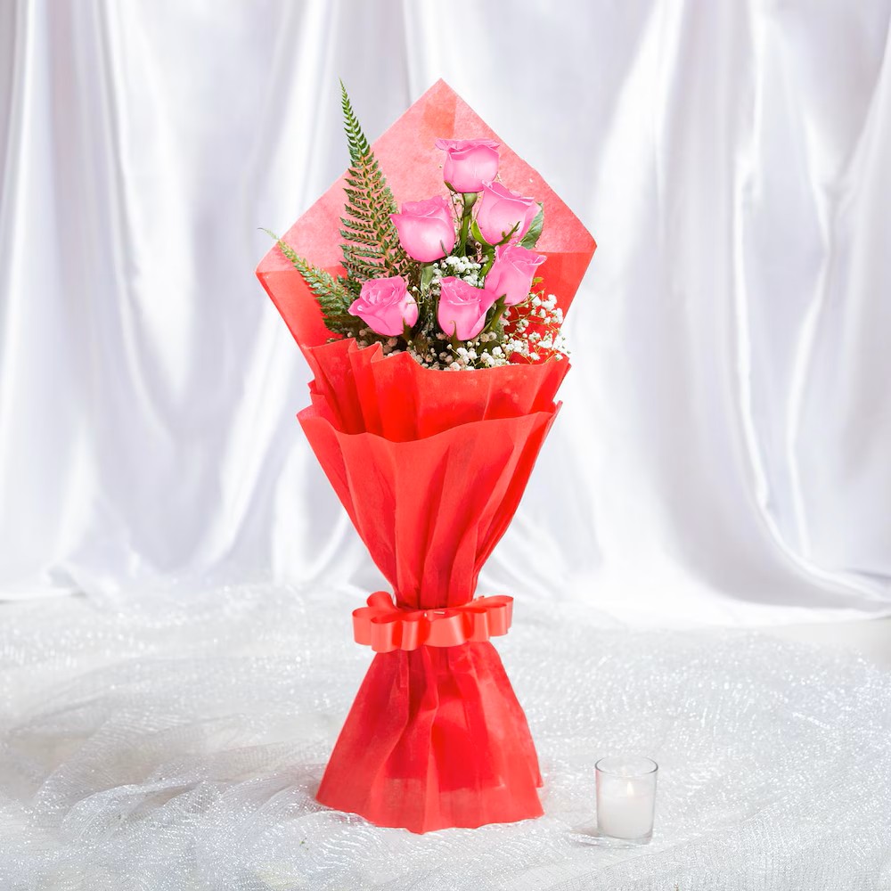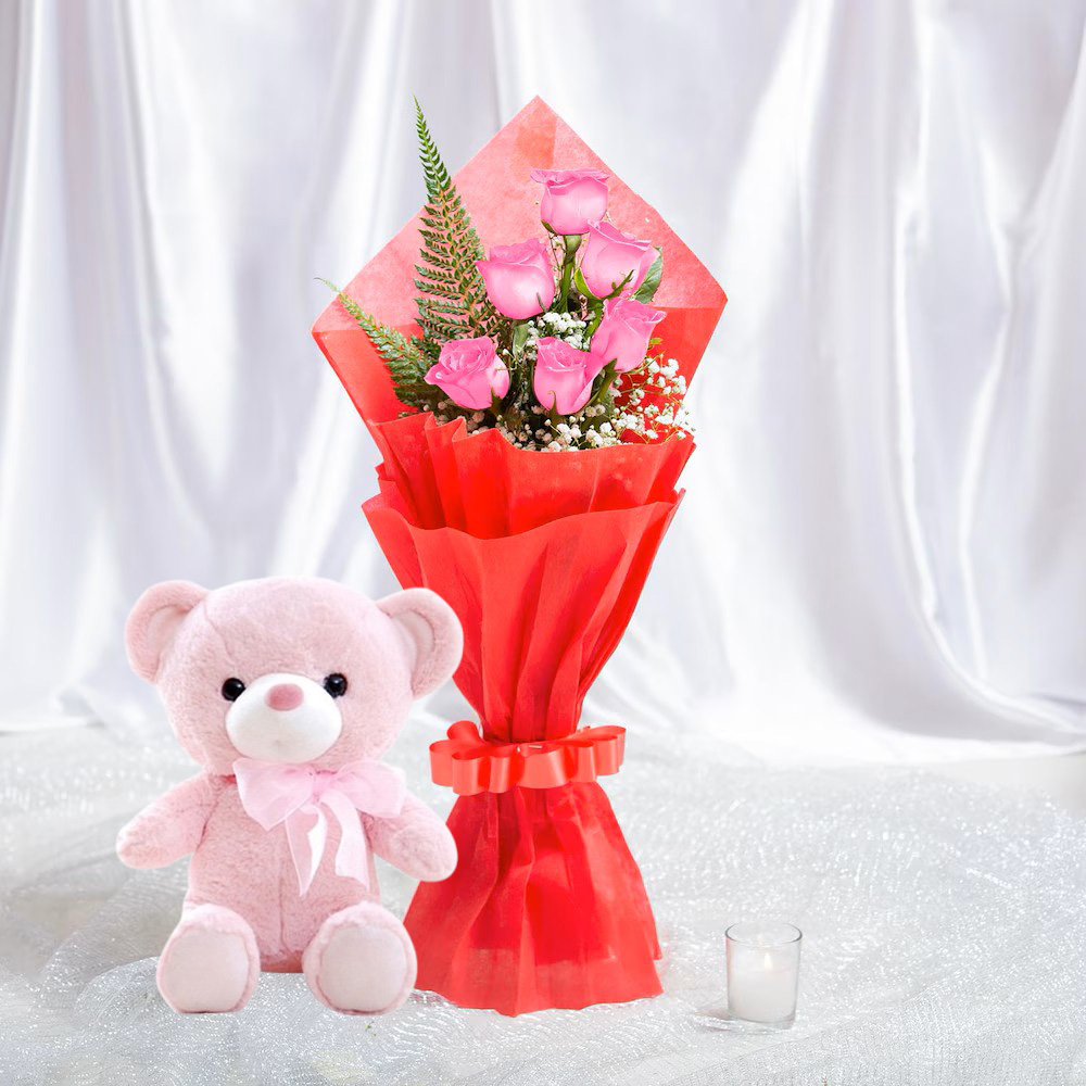 Express your sweet emotions with this charming bouquet of 6 fresh pink roses, beautifully wrapped in vibrant red paper packing and finished with a matching red ribbon bow. Paired with an adorable 6-inch teddy bear, this delightful combo is perfect for conveying love, admiration, and affection on any special occasion.