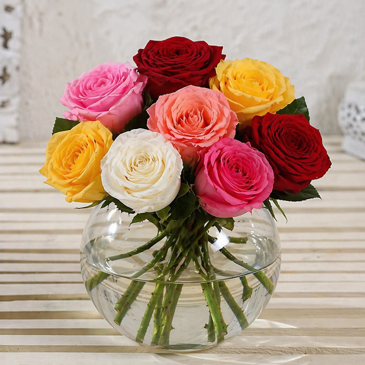 A vibrant arrangement of 8 mixed roses beautifully set in a clear glass vase, combining shades of red, pink, yellow, and white to express love, joy, and elegance—perfect for any special occasion.